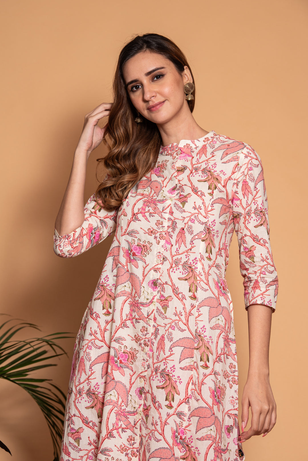 Pastel Pink Floral Printed Simple Cotton Kurti