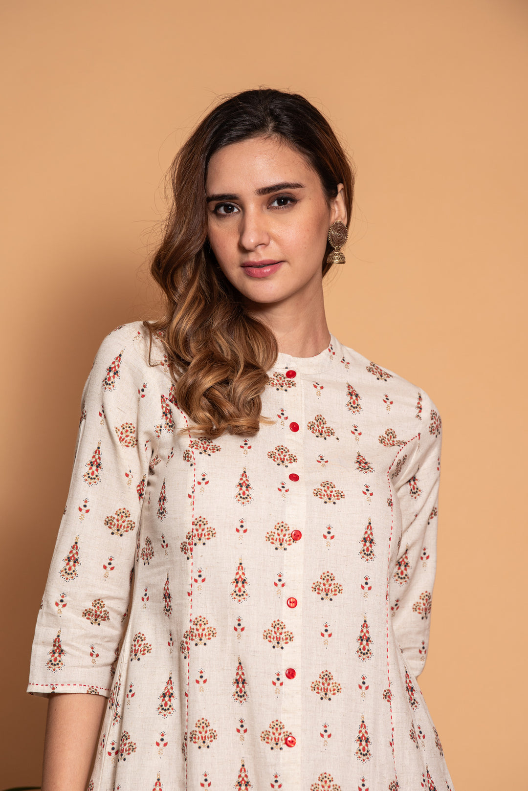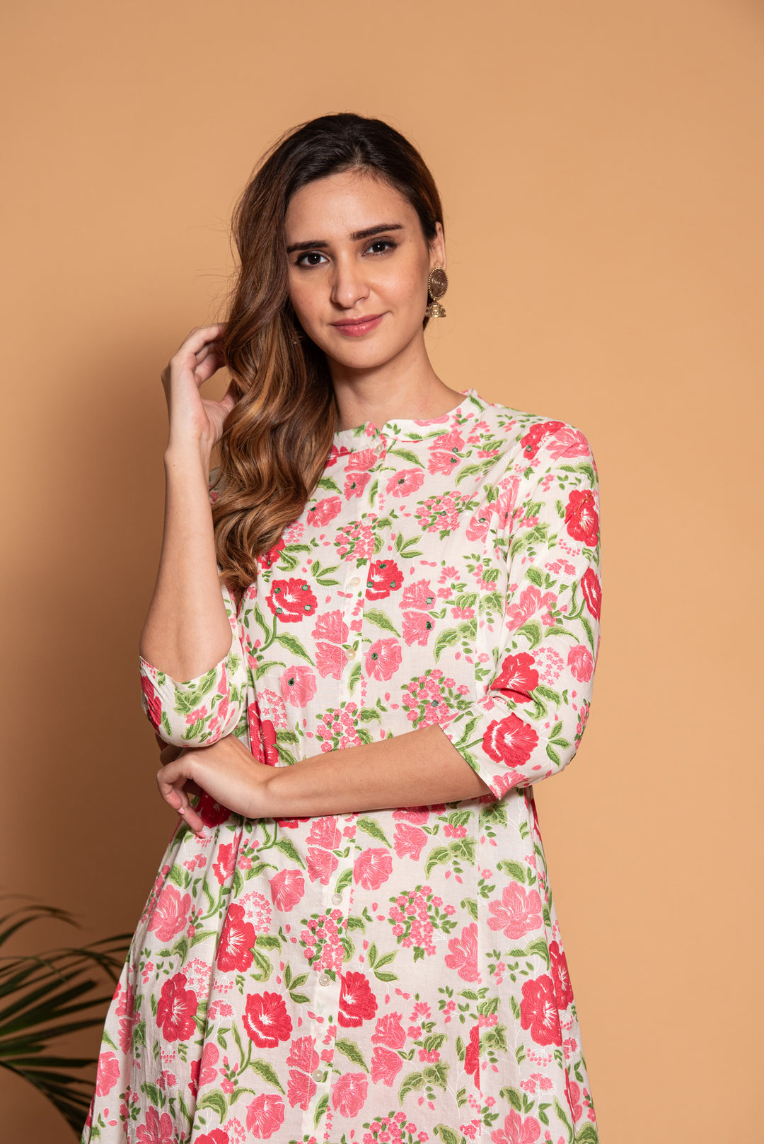 This off-white kurti adorned with vibrant red floral prints embodies the essence of Holi. The lively red contrasts beautifully with the white, reminiscent of the vibrant colors synonymous with the festival. The breathable cotton fabric ensures you stay comfortable, making it an ideal choice for Holi's daytime revelries.