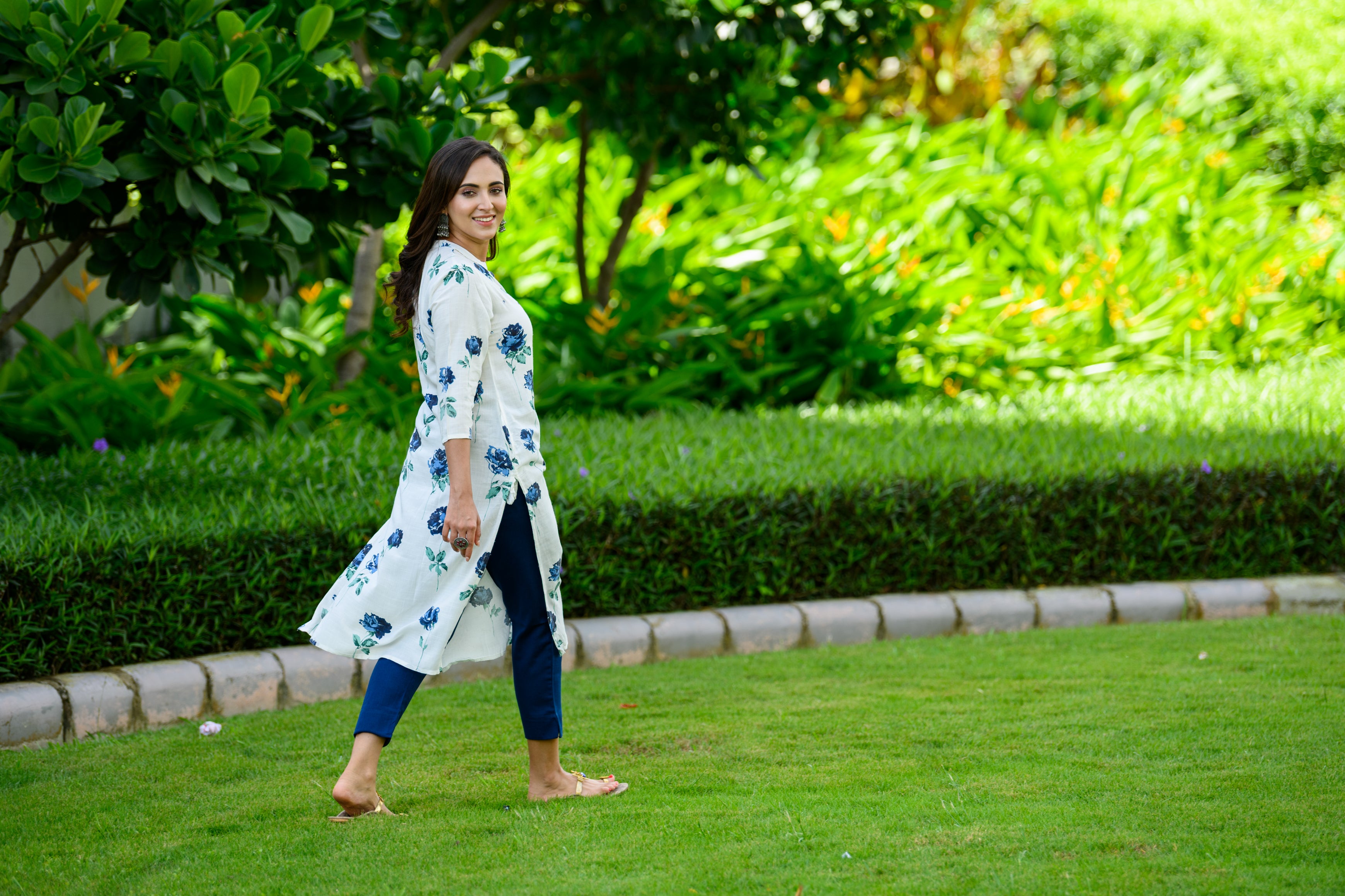 Sky Blue and Yellow Floral Printed Cotton Kurti